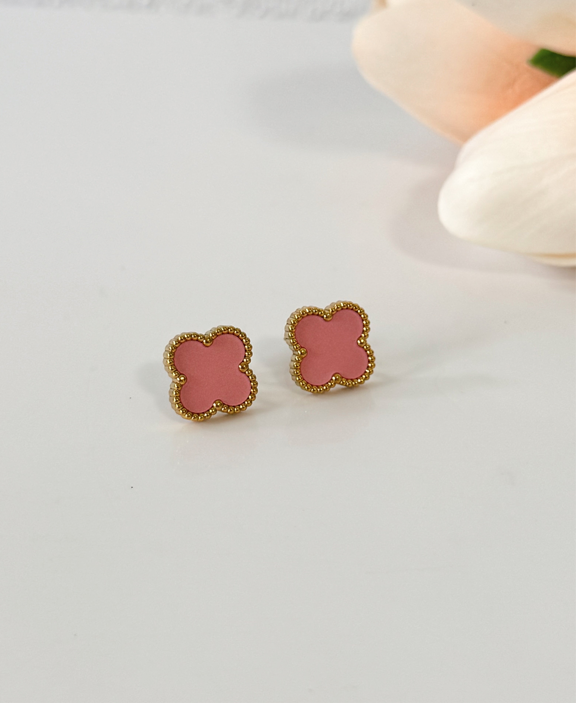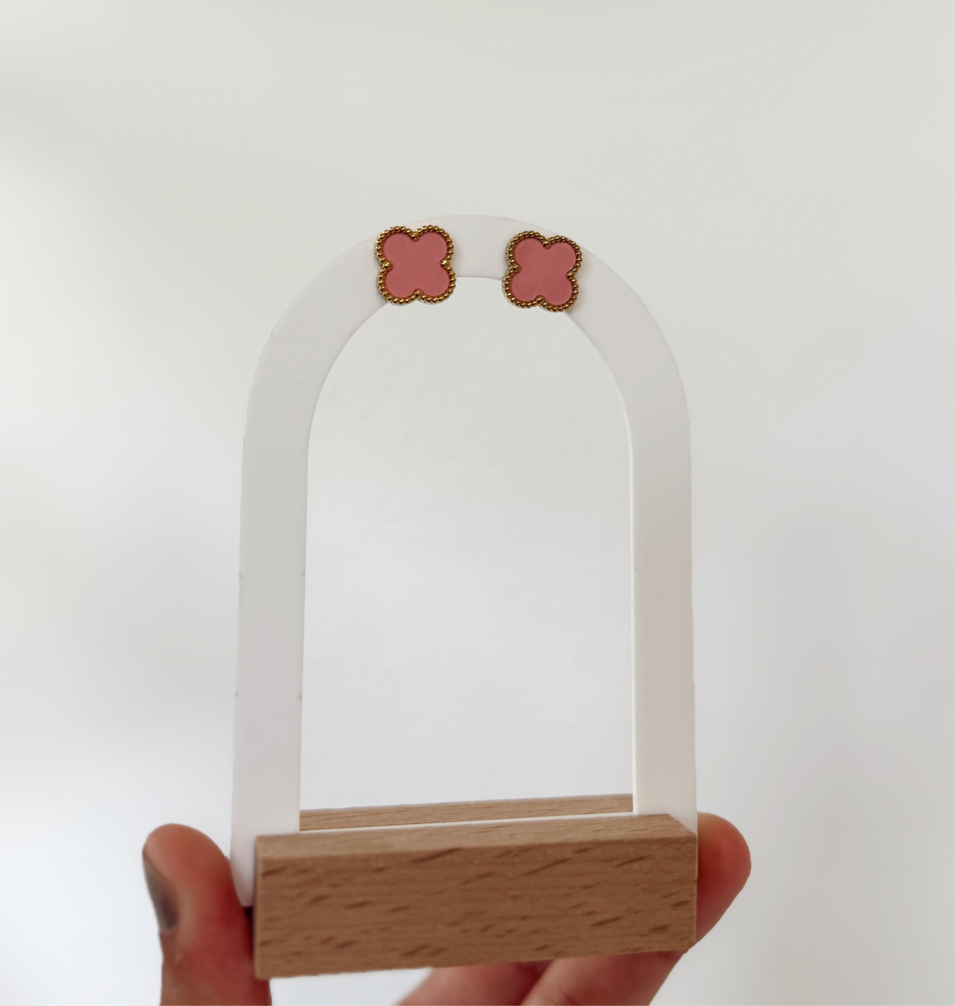 Nuestros aretes Clover en color rosa son una pieza que sin duda alguna no puede faltar en tu colección! Este accesorio aparte de estar en moda, es uno versátil, de calidad y perfecto para cualquier ocasión. Para terminar de brindarle un toque a tu look, puedes combinarlo con nuestro collar y brazalete Clover en color rosa.
