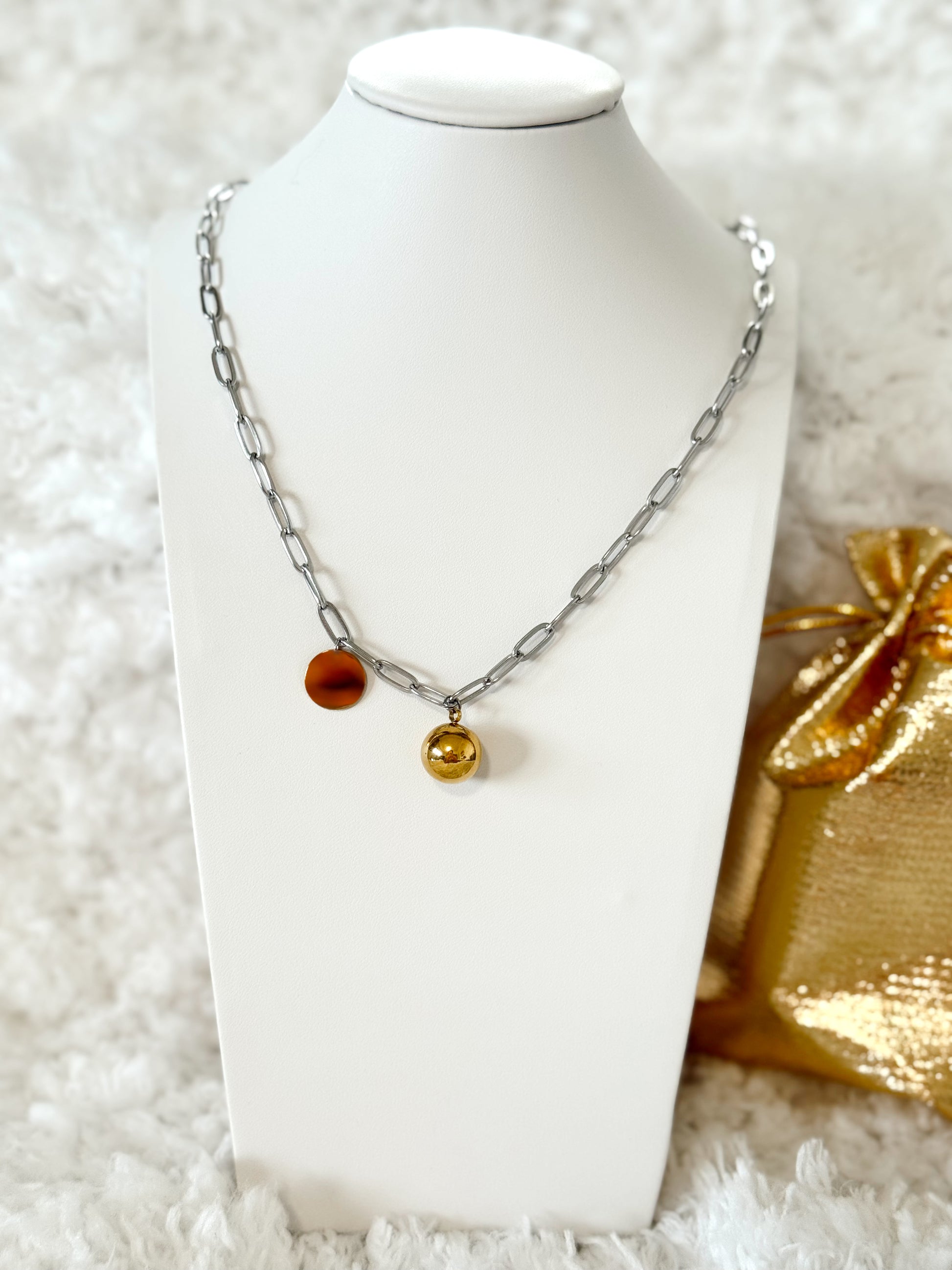 Añade un toque de estilo a tu outfit con nuestro collar Carlota- dos tonos. Está elegante pieza de joyería es perfecta para elevar tu look. Además es una pieza práctica, versátil y diferente.