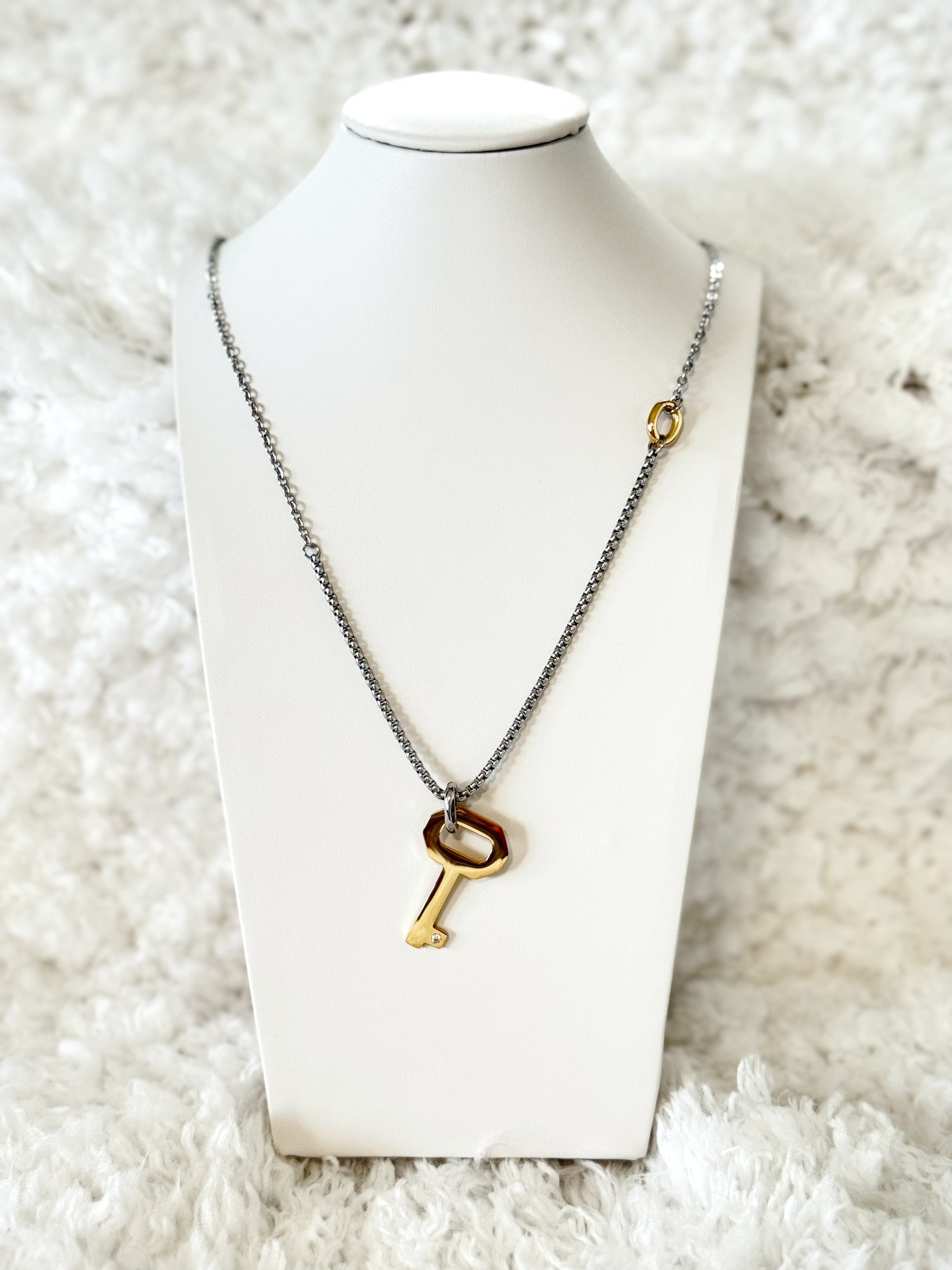 Añade un toque de estilo a tu outfit con nuestro collar Llave- dos tonos. Está elegante pieza de joyería es perfecta para elevar tu look. Además es una pieza práctica, versátil y diferente.